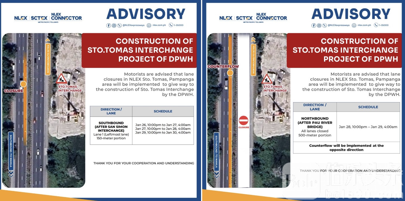 伯乐头条专讯:菲律宾北吕宋高速公路(NLEX)公司1月24日发布通告称,配合公共工程与公路部(DPWH)在邦板牙省推进的Sto. Tomas立交项目建设,NLEX部分路段将在指定时段实施临时封闭。相关措施主要安排在深夜至清晨,目的很明确——尽量减少对白天通行的影响,但司机朋友仍需提前做好心理准备。