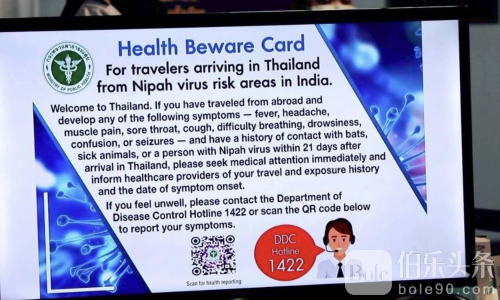 伯乐头条专讯:为防止尼帕病毒输入境内,泰国素万那普国际机场与廊曼国际机场自1月25日起,正式对来自印度西孟加拉邦的入境旅客启动健康筛查措施,全程依照国家防疫标准执行,并获得入境旅客、机场管理局及相关部门的积极配合。