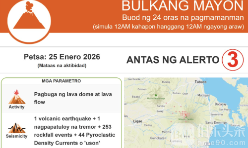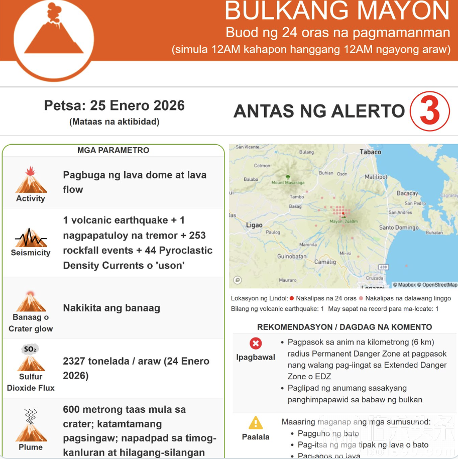 PHIVOLCS维持三级警报(Alert Level 3),禁止进入6公里永久危险区,同时提醒民众不要随意进入扩展危险区。该机构警告,火山周边飞行存在危险。