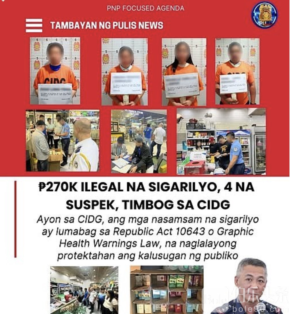 伯乐头条专讯:1月22日深夜,菲律宾国家警察刑事侦查组(CIDG)在帕赛市展开同步突击,在Shore 2 Residences内一举查处两家涉嫌违规经营的商铺,当场控制4名嫌犯,查获未依法标注健康警示的非法香烟,涉案市值超过27万比索。