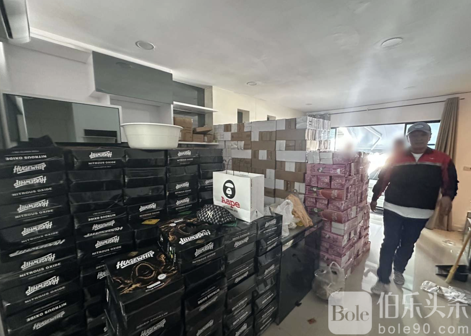 伯乐头条专讯:泰国警方近日在曼谷展开突击行动,成功捣毁一个非法走私、囤积并贩卖“笑气”的大型犯罪网络,当场拘捕5名中国籍嫌犯,查扣笑气1,770罐,总价值超过350万泰铢,案件仍在进一步扩大侦办中。