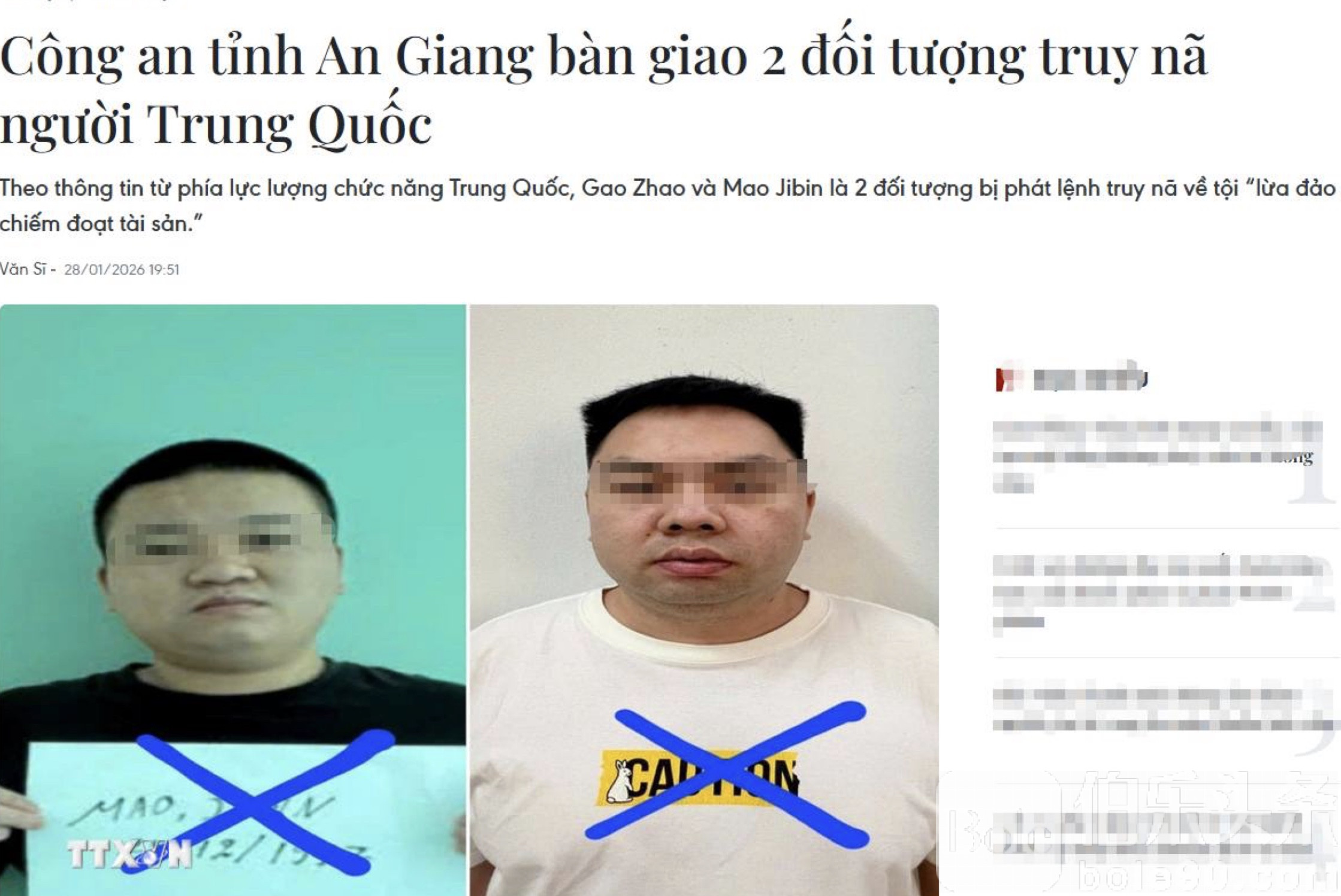 伯乐头条专讯:1月28日,越南安江省公安厅在谅山省友谊国际口岸展开高效执法行动,将两名涉嫌诈骗的中国籍通缉犯依法移交中方职能部门。这两名嫌疑人分别来自云南的高照(Gao Zhao)和湖南的毛继斌(Mao Jibin),在国际执法合作中被成功抓获。