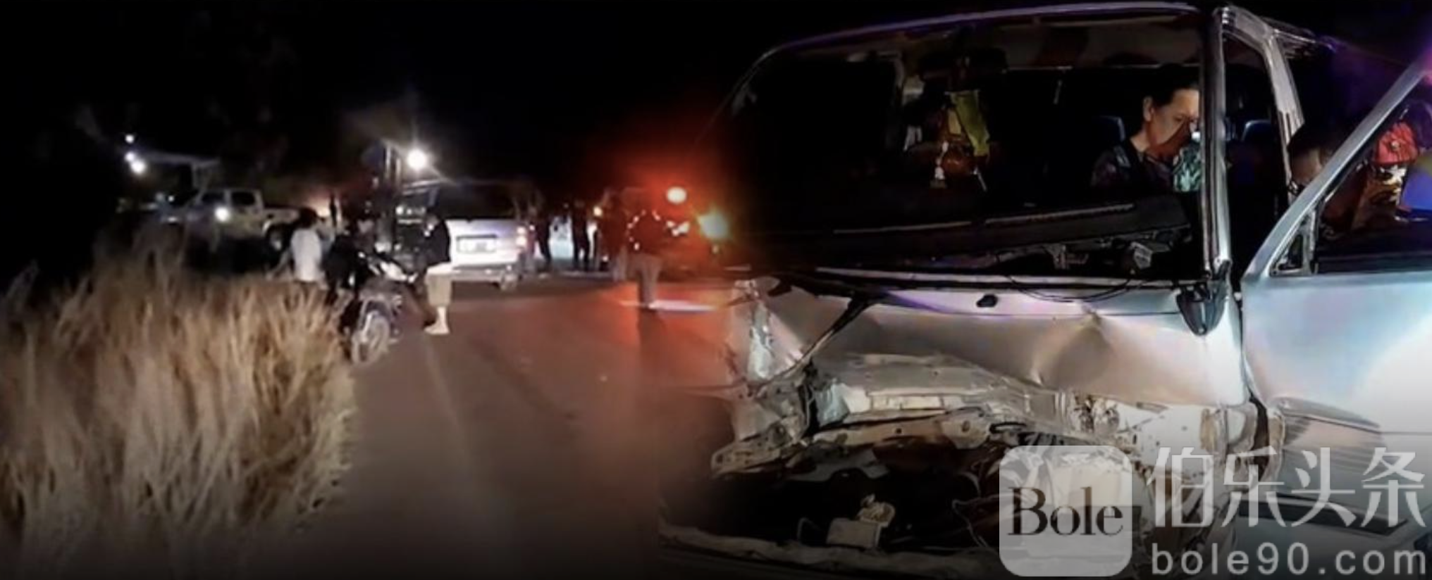 Bole新闻专讯:2月1日晚,泰国猜也米府农宝登县南黛乡班农毛–农宝登路段发生一起严重交通事故,一辆小巴追尾一辆满载甘蔗的拖拉机后,又与迎面而来的黑色丰田皮卡相撞,造成8人受伤。事故现场甘蔗散落一地,三辆车严重受损。