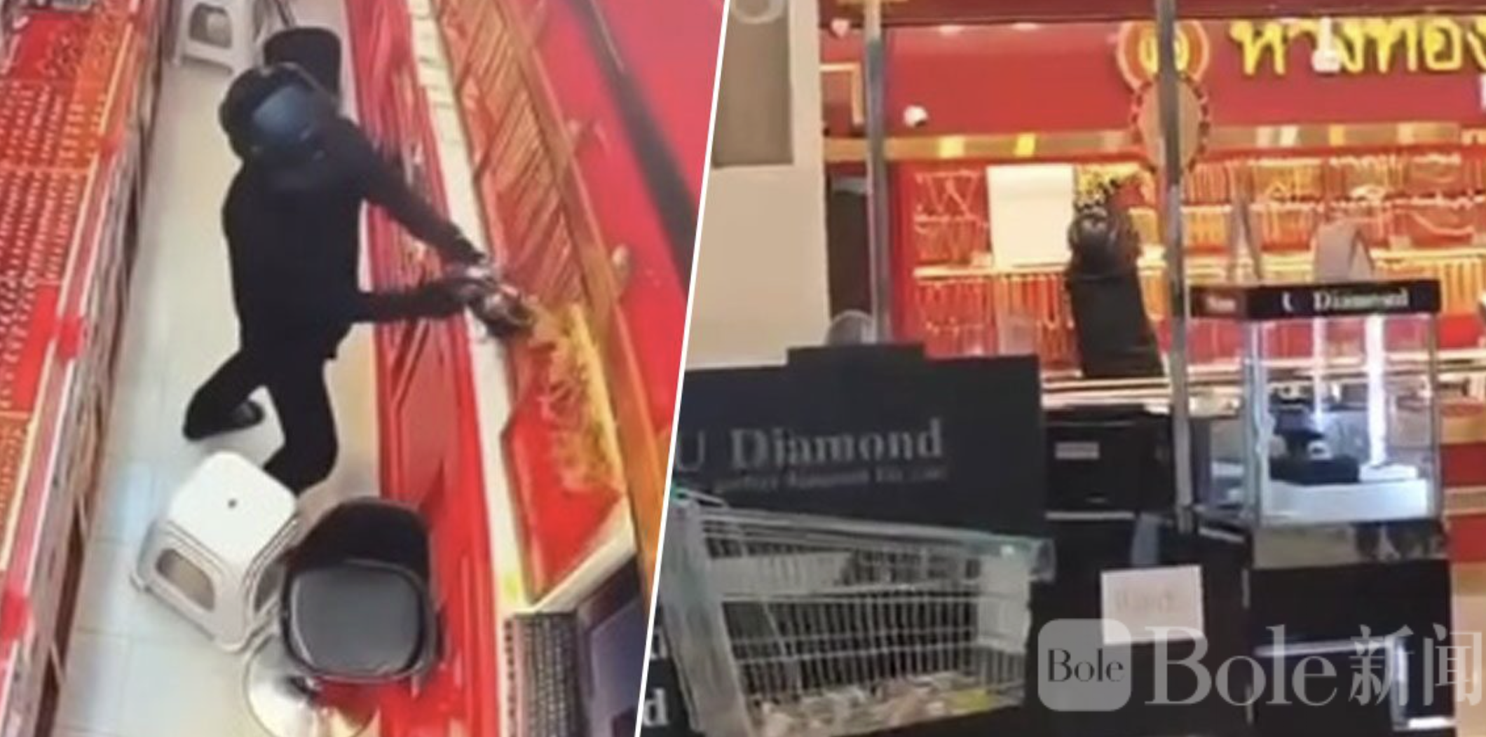 Bole新闻专讯:泰国南部宋卡府合艾市一座知名购物中心3日晚突发惊险抢劫案,一名持枪歹徒单枪匹马闯入商场内的金店,砸碎展示柜后抢走约60铢(约900克)金项链,当场逃离,整个过程被闭路电视完整拍下,引发当地民众震惊。