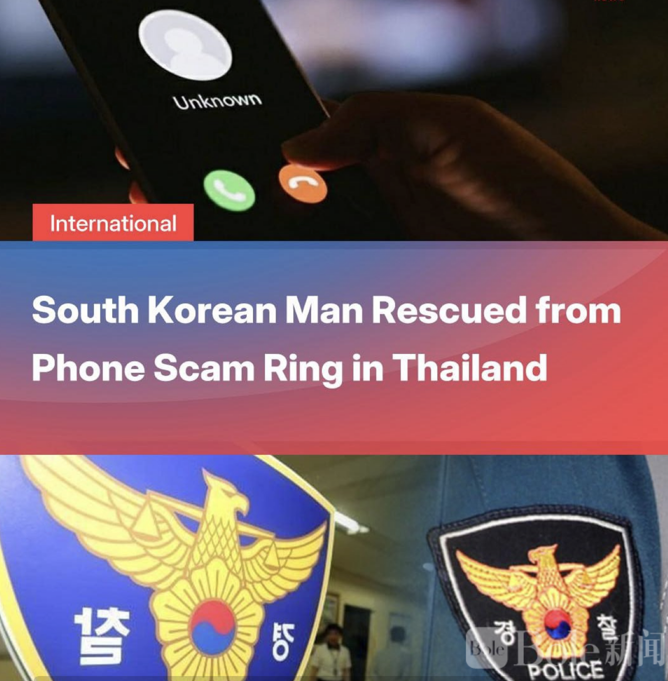 Bole新闻专讯:韩国京畿道抱川市一名30多岁男子近日因轻信“泰国高薪工作”招聘信息,被诱骗前往泰国后遭跨国电话诈骗集团控制,所幸其暗中向家人求救,最终在韩泰警方及外交机构的联合行动下成功获救。
