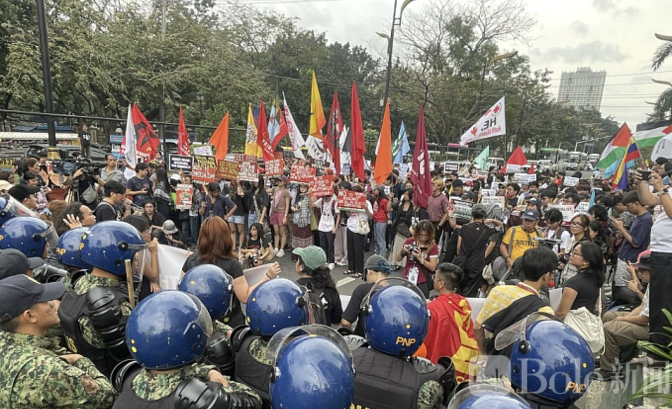 Bole新闻专讯:2月6日(周五),菲律宾首都马尼拉街头出现反美抗议场面。当天,左翼团体“新爱国联盟”(Bayan)成员在美国驻菲律宾大使馆附近集结,并试图沿卡拉乌大道(Kalaw Avenue)向使馆方向游行,但在卡拉乌大道与罗哈斯大道(Roxas Boulevard)交界处遭警方拦截,道路一度被封锁。