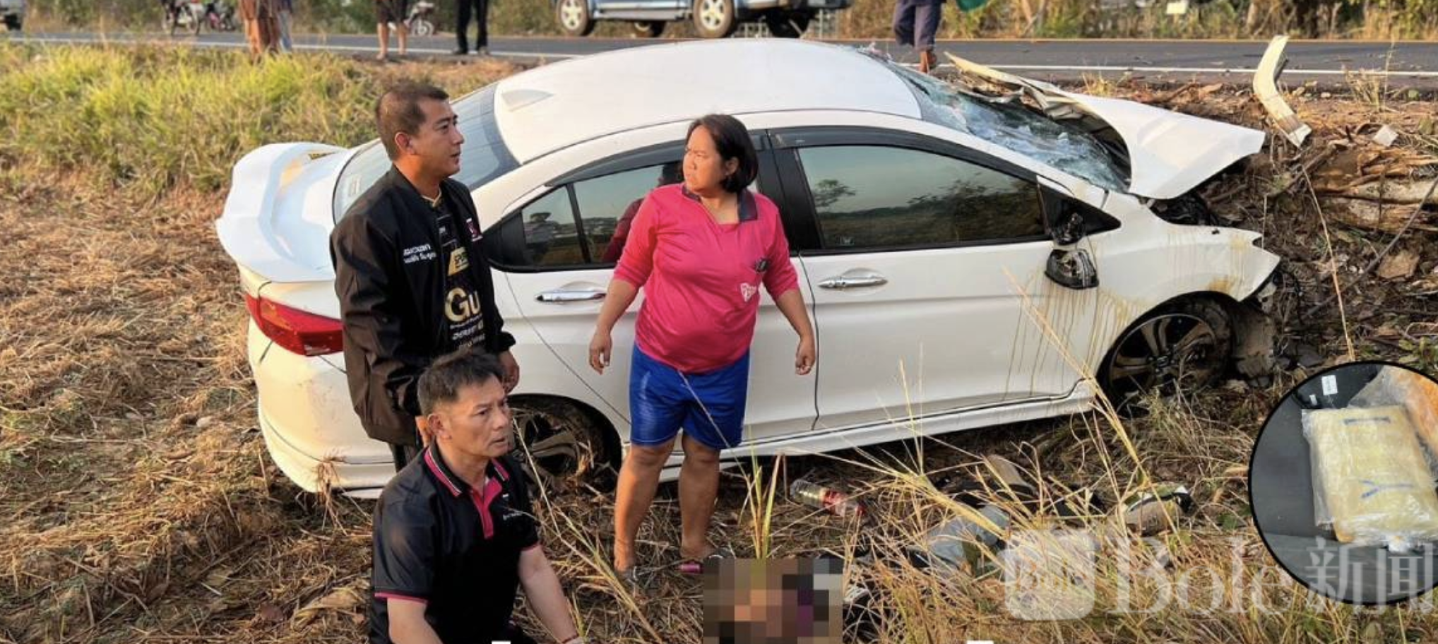 事件发生在15日清晨,地点位于乌汶府坤英县纳坎亚镇通往盛诺伊村的一条乡村公路。当地警方接到报警称,一辆白色本田轿车在路边翻覆,有两名男子伤势严重。