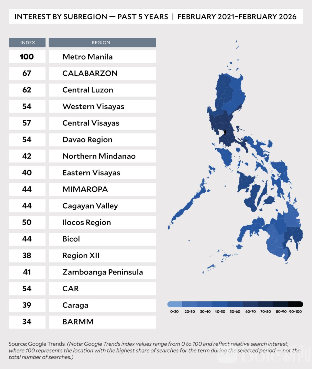 在春节来临的前几天,“岷伦洛”相关搜索迅速飙升,查询内容多半与实用信息相关:怎么去、哪里吃、哪里拜、哪些景点值得看。这也反映出,人们对春节的体验不仅是观赏,更是参与和感受。Metro Manila 的搜索指数达到 100,而卡拉巴松地区(Calabarzon)和中吕宋(Central Luzon)也分别达到了 35 和 26,显示兴趣虽集中于首都,但热情辐射至周边地区。