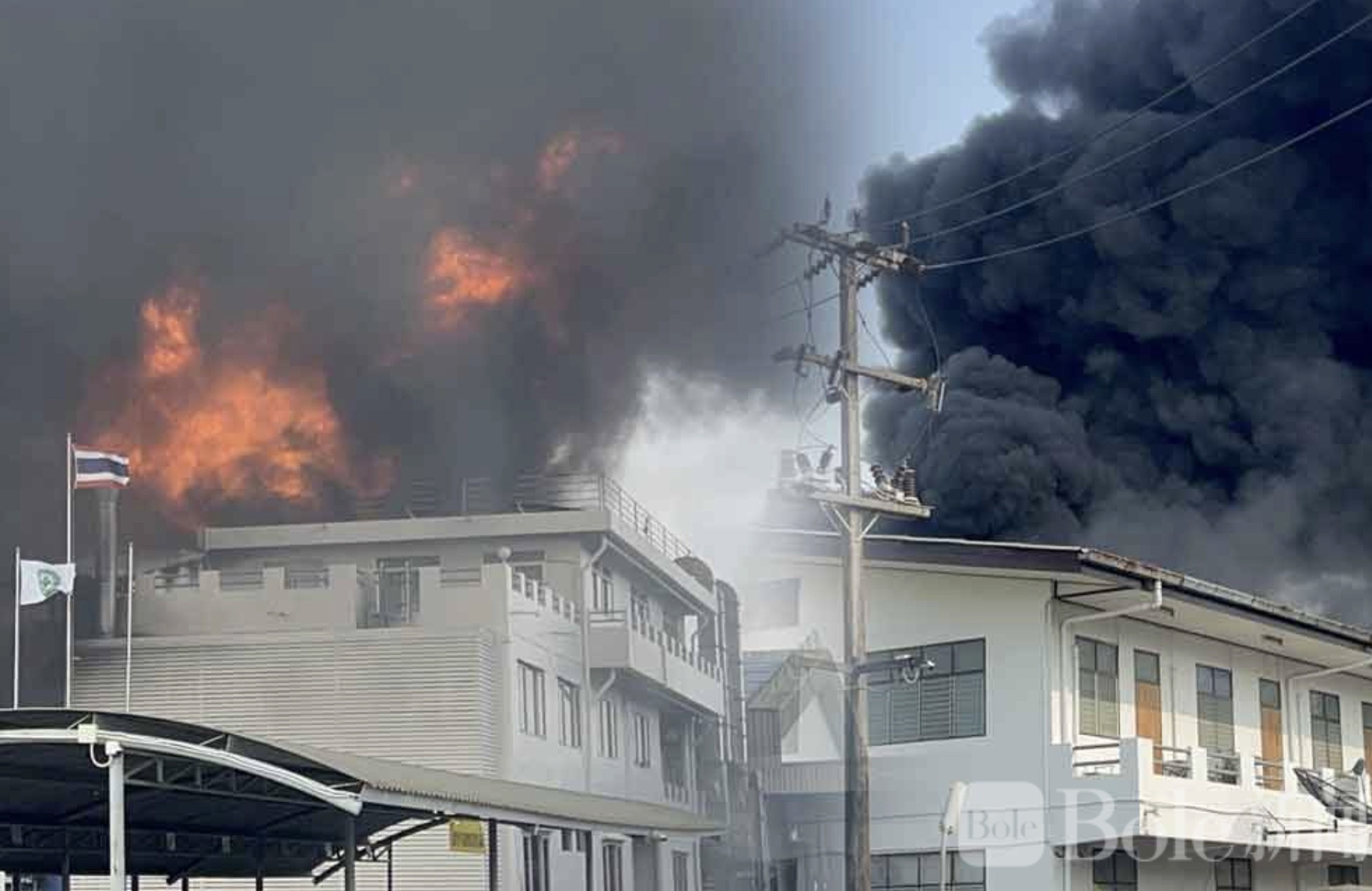 Bole新闻专讯:泰国春武里府攀通县一间油漆混合工厂18日下午突发火灾,火势凶猛并伴随间歇性爆炸声,十余辆消防车紧急驰援,但超过40分钟仍未能完全控制火情,现场一度浓烟冲天,情况相当惊险。