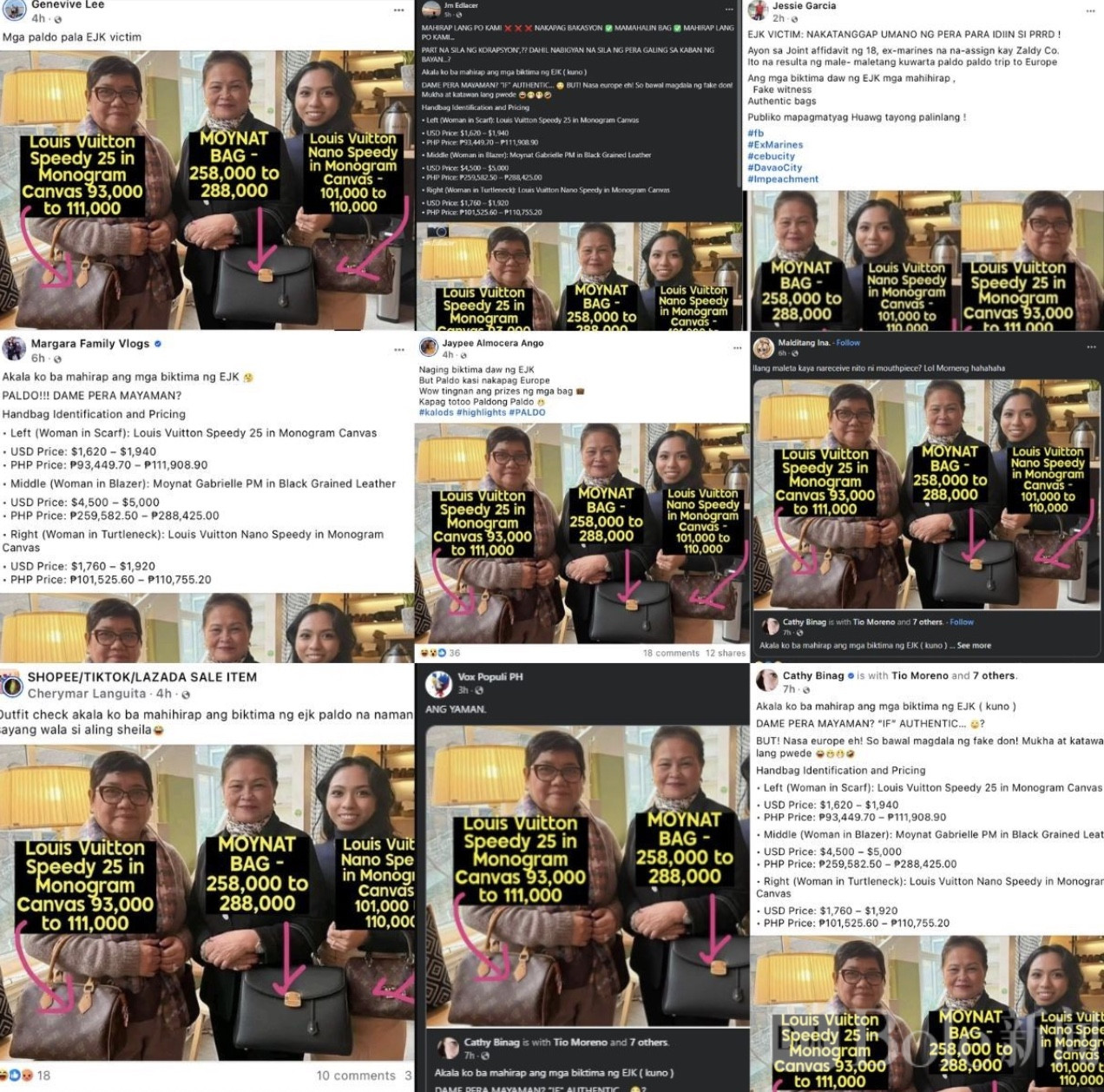 被篡改的照片显示Rise Up for Life and for Rights组织的Rubilyn Litao,以及受害者亲属Llore Pasco和Sheerah Escudero,手中似乎拎着路易威登(Louis Vuitton)和Moynat名牌包。然而,原始照片是ONE News主播Angela Lagunzad-Castro于2月22日在海牙新闻发布会上拍摄,三人站在一起时并未携带任何物品。