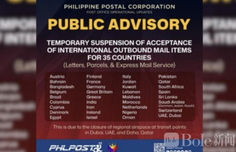 Bole新闻专讯:受中东地区局势升级影响,菲律宾邮政公司(PHLPost)宣布,暂时停止寄往35个国家的国际出境邮件收寄服务。此次调整主要涉及信件、包裹及特快专递(EMS),凡是邮件运输路线需经由阿联酋迪拜或卡塔尔多哈中转的国家,均在暂停范围之内。