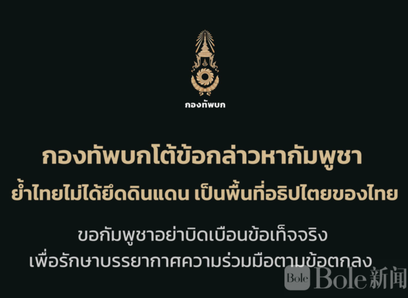 Bole新闻专讯:泰国陆军5日正式回应柬埔寨方面关于“泰军攻击并占领柬埔寨领土”的指控,强调相关说法严重歪曲事实,并重申目前泰军所控制的区域全部属于泰国主权范围之内,并非侵占柬埔寨土地。