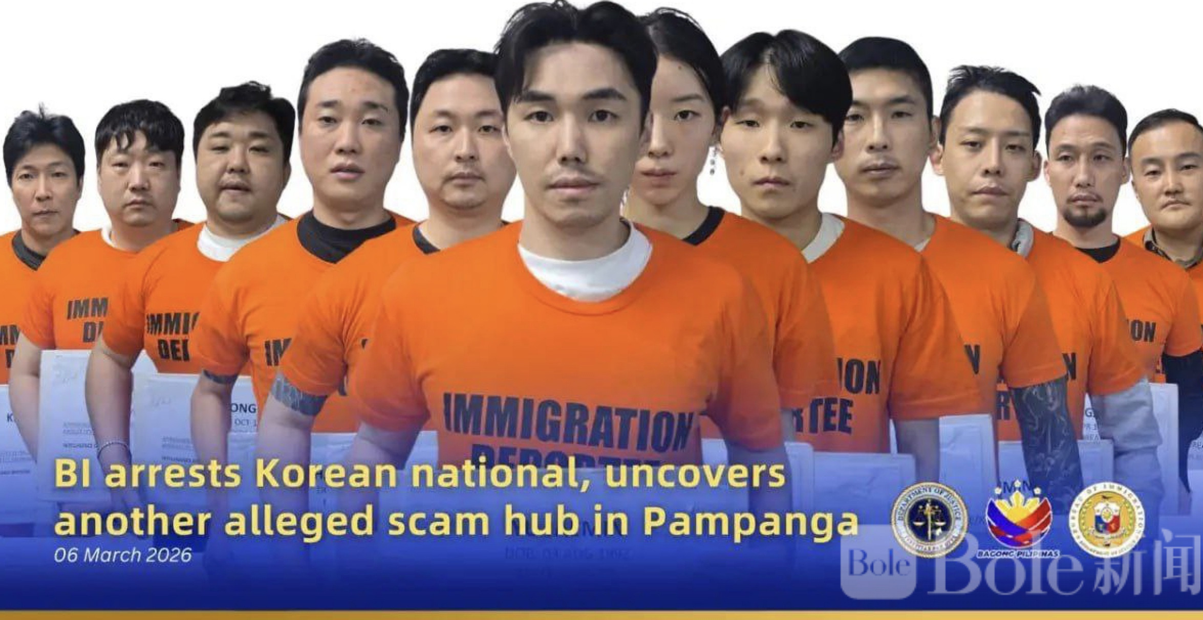 Bole新闻专讯:菲律宾移民局(BI)近日在邦板牙省安吉利斯市(Angeles City,又称“天使城”)展开突袭行动,一举捣毁疑似外国诈骗中心,现场抓获11名韩国籍人员,其中包括涉嫌组织运营的主嫌。