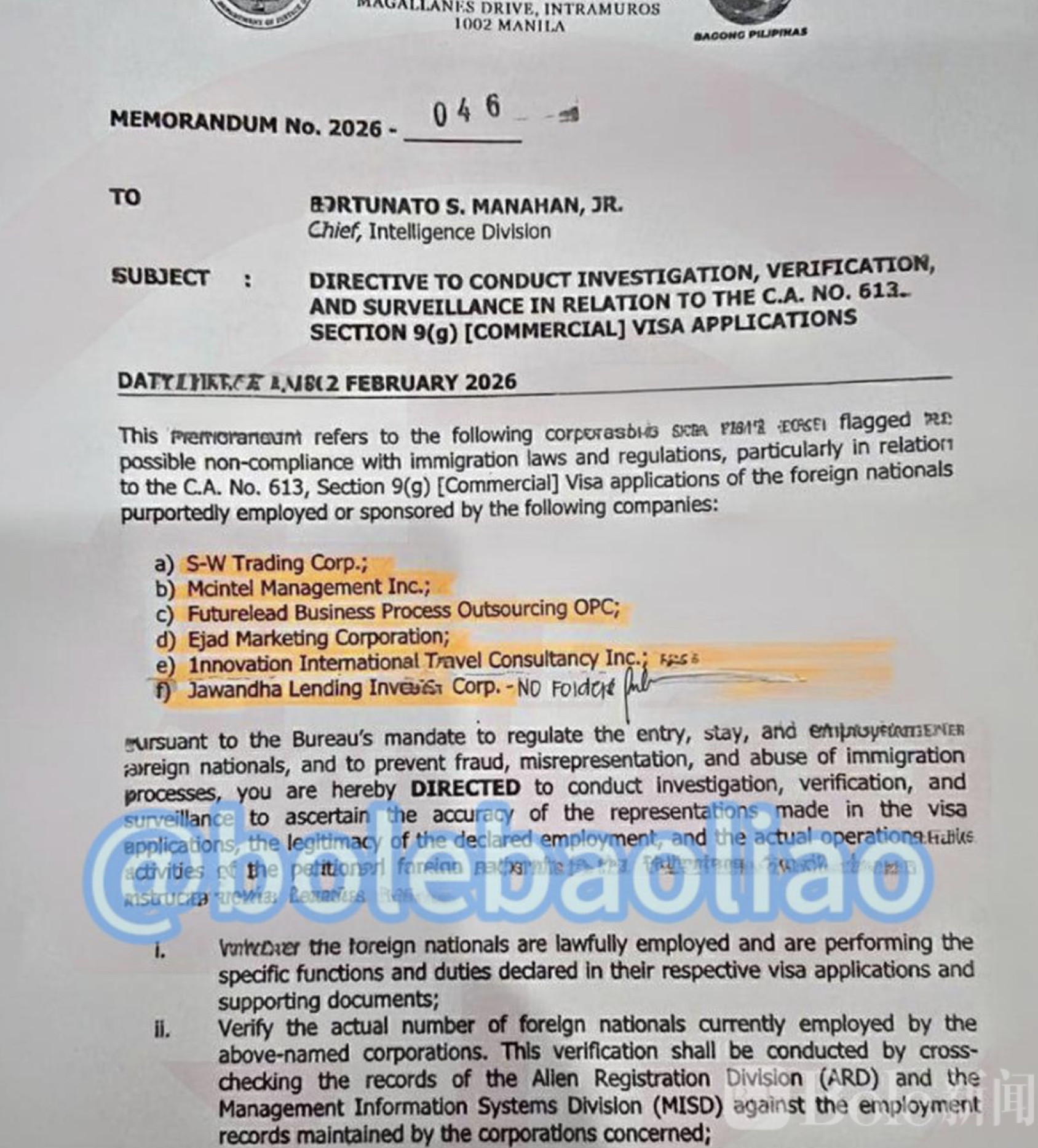 根据2月12日发布的官方备忘录,移民局情报部门负责人Fortunato S. Manahan Jr.被指示对以下企业开展调查,这些公司可能在C.A. No. 613第9(g)条商业签证申请中存在违规或虚假申报: