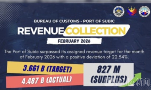 Bole新闻专讯:菲律宾苏比克港口海关局(BOC-POS)近日公布,2026年2月的税收收入超额完成目标,总额达到44.87亿披索,比原定36.61亿披索高出约8.27亿披索。