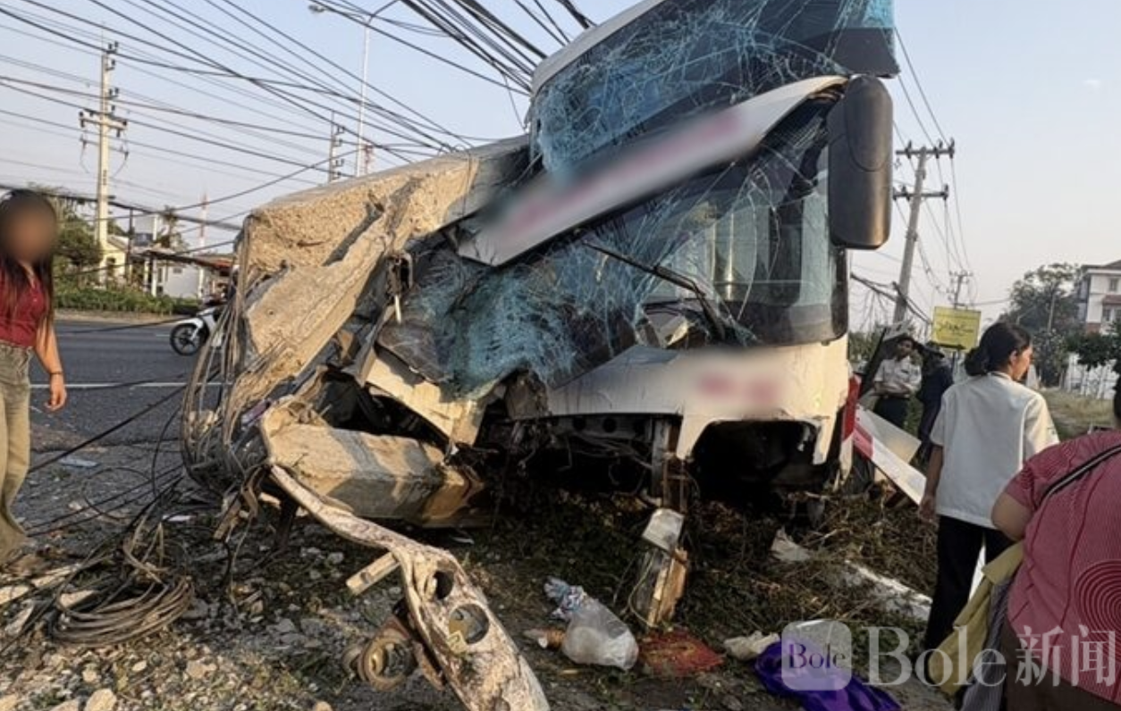 Bole新闻专讯:泰国碧武里府今晨发生一起严重交通事故,一辆载有乘客的长途大巴在行驶途中突然失控,猛撞路边电线杆,造成大量乘客受伤,现场一片狼藉。