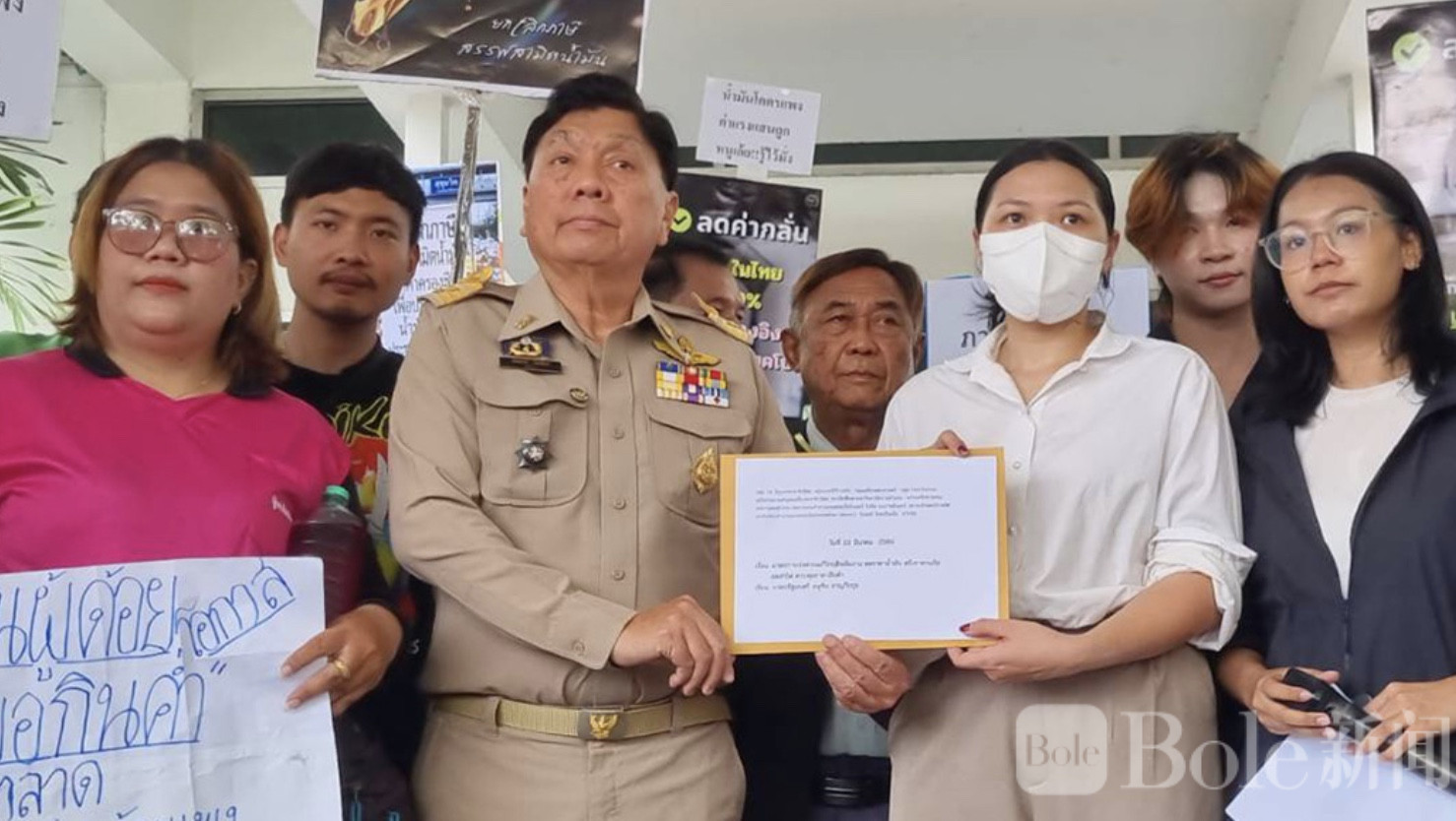 Bole新闻专讯: 3月23日,泰国首都政府大楼迎来一场非同寻常的民间行动,由14个社会组织组成的联盟在公民领袖带领下,向总理兼内政部长阿努廷递交请愿书,敦促政府立即采取措施应对能源危机,降低油价、稳定液化气价格,并控制电费及生活必需品价格。现场拉起标语横幅,气氛紧张而庄重。