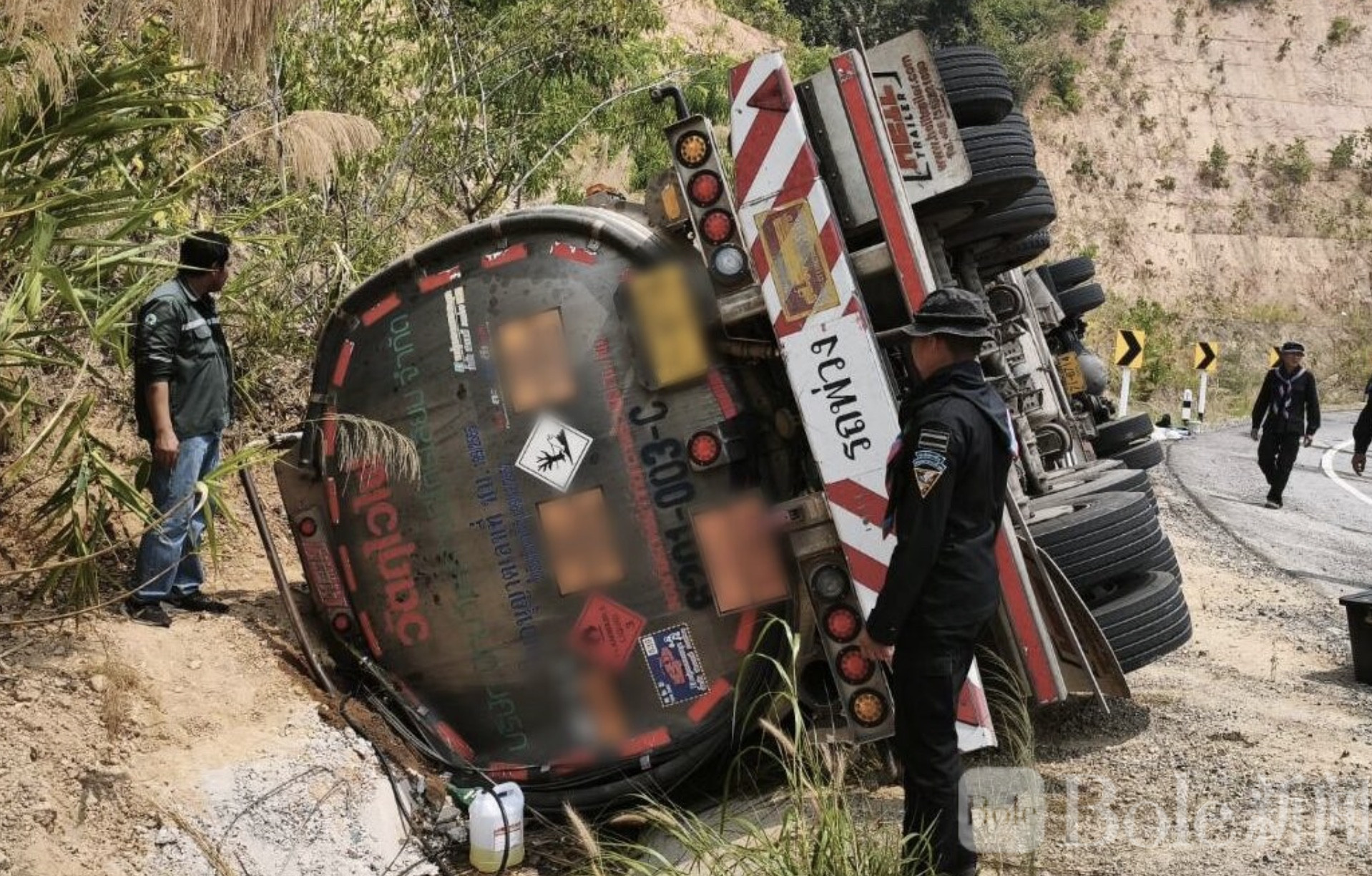 Bole新闻专讯:泰国楠府一条通往边境的山路上,近日发生一起颇为惊险的交通事故——一辆满载柴油的油罐车在行驶途中突然失控侧翻,所幸未引发爆炸或大规模泄漏,仅造成司机轻微受伤。