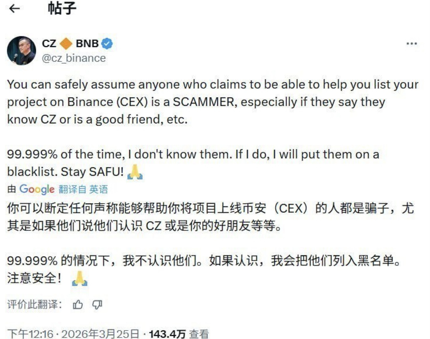 Bole新闻专讯:3月25日,币安创始人赵长鹏在X平台发文提醒广大用户注意,以“帮助项目在币安上线”为名的各类诈骗行为。他直言不讳地指出,凡自称能协助项目上币,或者声称认识自己或其好友的人,几乎百分之百都是骗子。