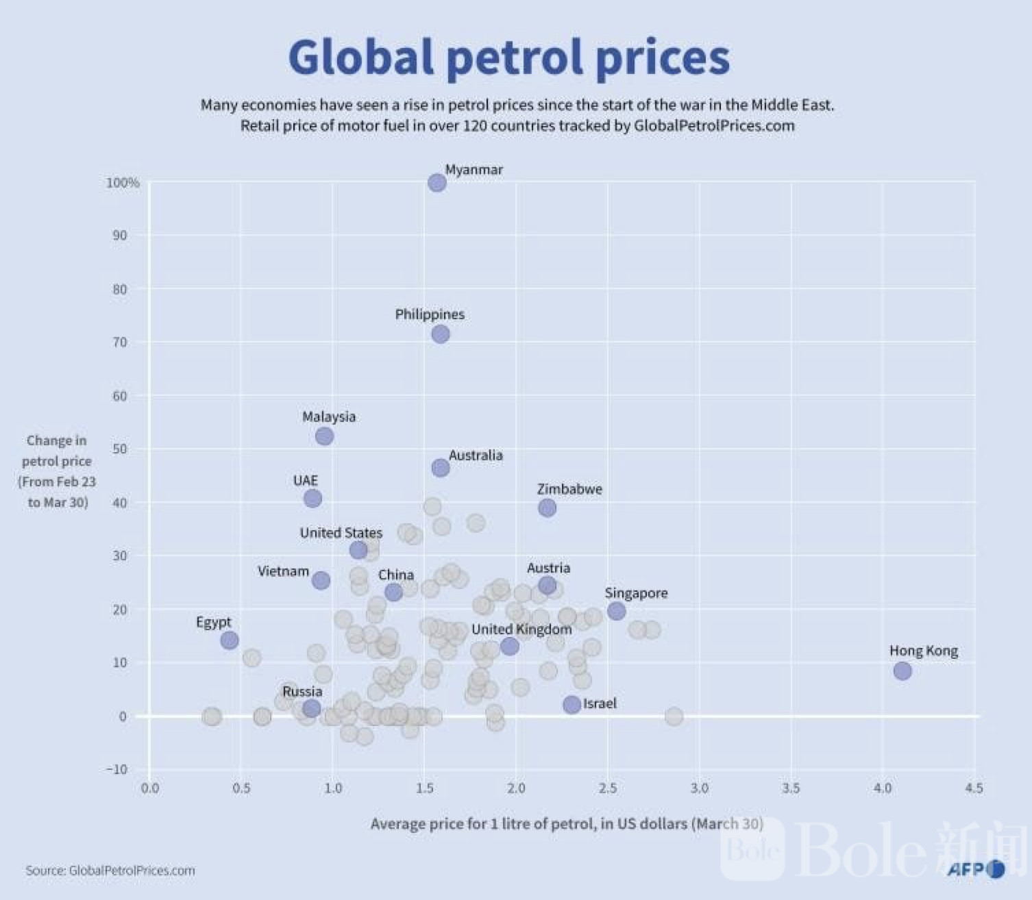 根据法新社援引 GlobalPetrolPrices 数据制作的统计图显示,从今年2月下旬到3月下旬,全球超过120个国家的汽油价格普遍上涨。大多数国家的涨幅落在10%至40%之间,看起来虽然不算温和,但还在可控范围内。不过,也有少数国家的油价像踩了油门一样往上冲,涨势明显失控。