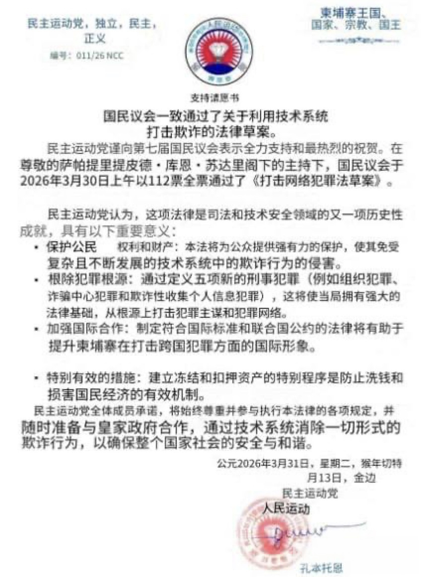 Bole新闻专讯:柬埔寨国会近日一致通过《打击网络诈骗法案(Online Scam)》,引发各方关注。民主运动党也公开表态支持该法案,这一立场彰显了柬埔寨在整治网络诈骗行动上,正获得更广泛的政治层面支持。