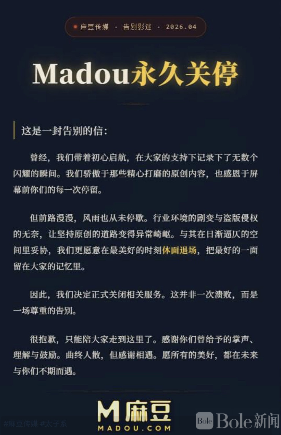 Bole新闻专讯:随着“太子系”核心人物相继被抓,相关产业链正迎来一轮明显的震荡。近日,曾在业内颇具知名度的麻豆传媒发布公告,宣布将正式关闭相关服务。这家曾活跃一时的内容制作团队,也在一封带着几分感伤的告别信中,向外界宣告自己的谢幕时刻。