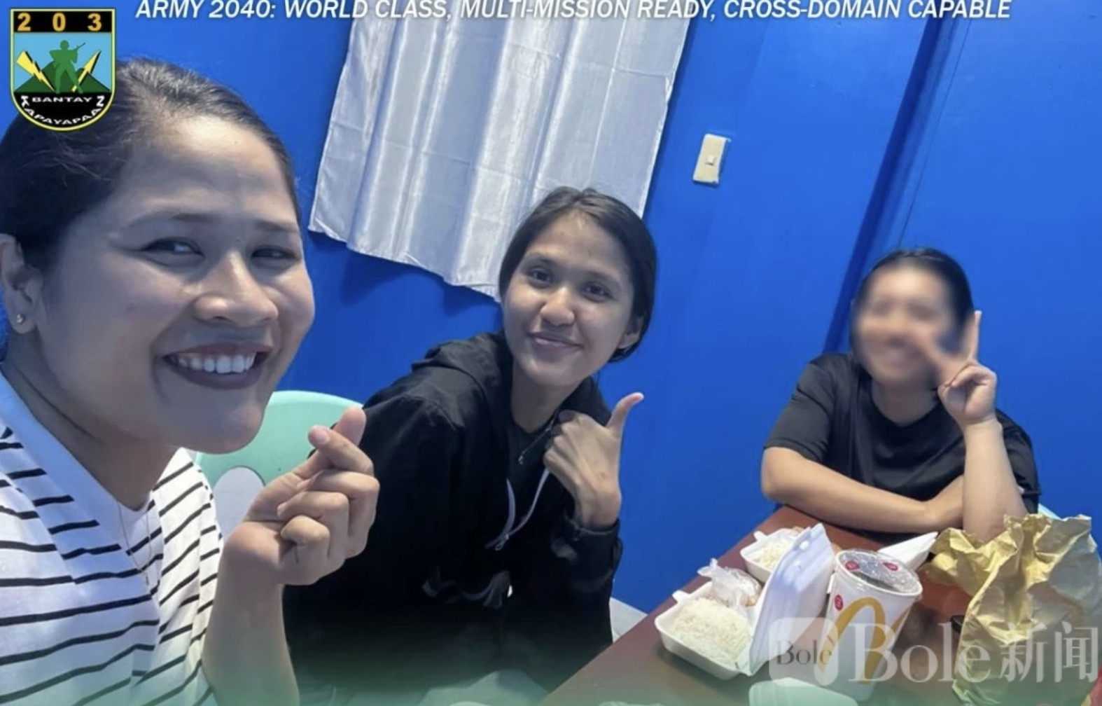 Bole新闻专讯:菲律宾军方于4月4日公布多张照片,回应针对被捕女性新人民军(NPA)嫌疑人Charlize Cameron Garzon的虐待指控。此次拘押源自上周在西米沙鄢省圣何塞发生的一次交火行动,当场一名军官Dean Buen Oyando不幸阵亡。