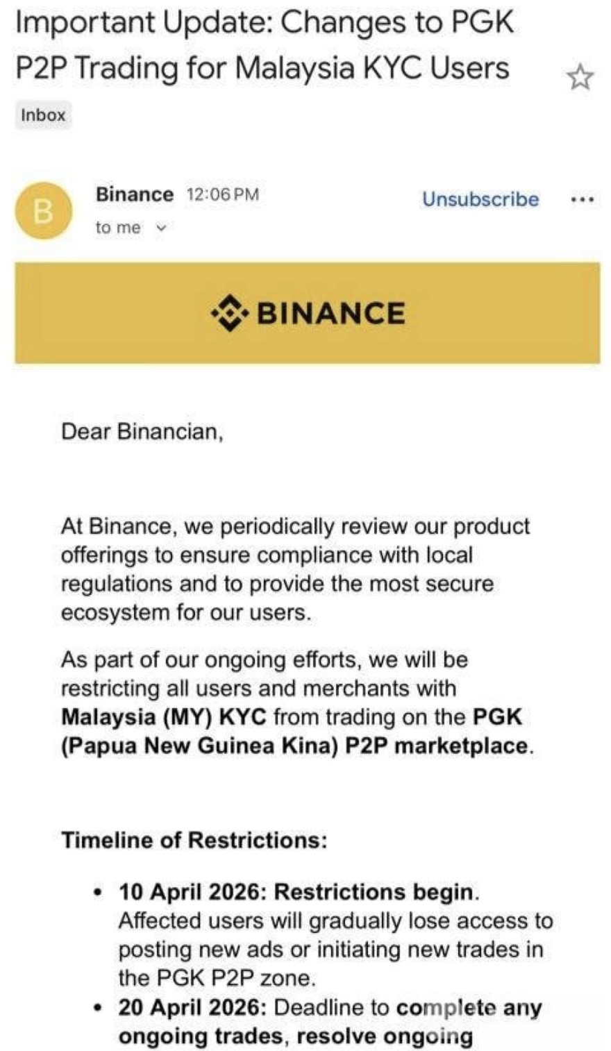 此外,监管机构此前发现,币安曾通过点对点交易功能,用巴布亚新几内亚货币作为中介进行马币配对交易,相关交易已在沟通后被移除。分析人士认为,这轮分阶段限制,凸显马来西亚在保护本地投资者利益、维护金融体系稳定方面的决心,也提醒投资者密切关注数字资产交易平台的合规状况。