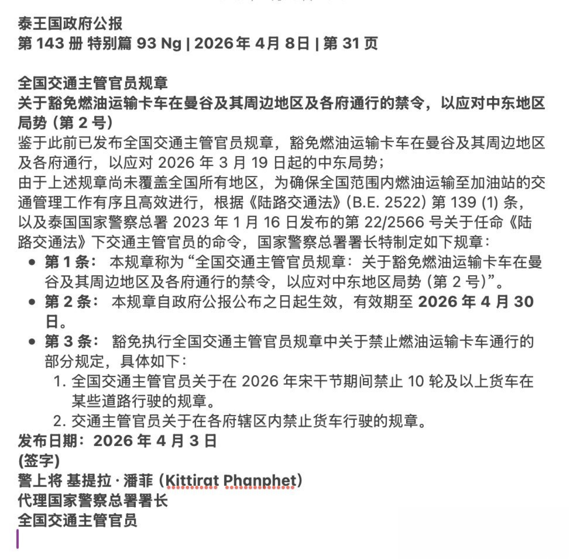 不过,官方同时表示,油罐车运输不受限制,可在全国范围内通行至4月30日,以保障燃油供应及民生需求稳定。