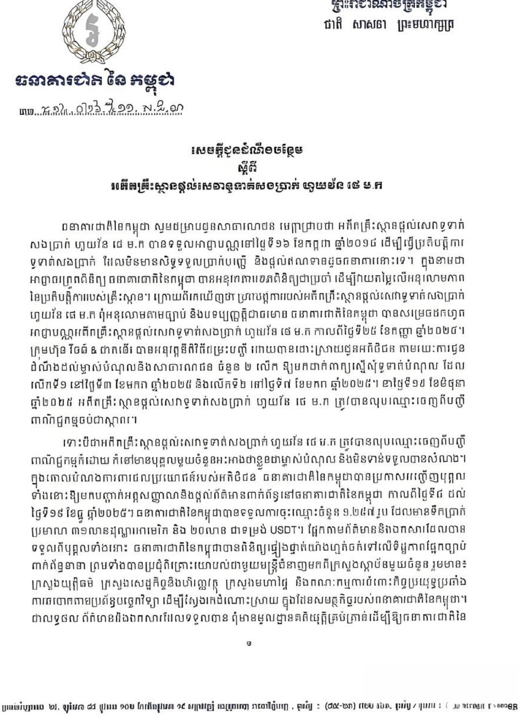 Bole新闻专讯:围绕已被注销的支付服务机构“汇旺支付”的债权争议,柬埔寨国家银行(央行)近日再次发布补充说明,对外界关注的相关问题作出进一步回应,并明确表示,涉及该机构的债权纠纷仍需通过司法程序解决。