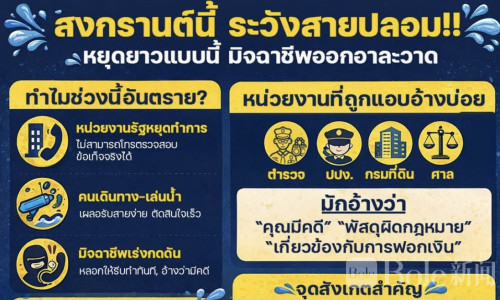 Bole新闻专讯:泰国警方发出紧急提醒,指出宋干节期间电信诈骗案件明显增多,不法分子频繁冒充政府官员实施诈骗,呼吁民众提高警惕,避免落入陷阱。