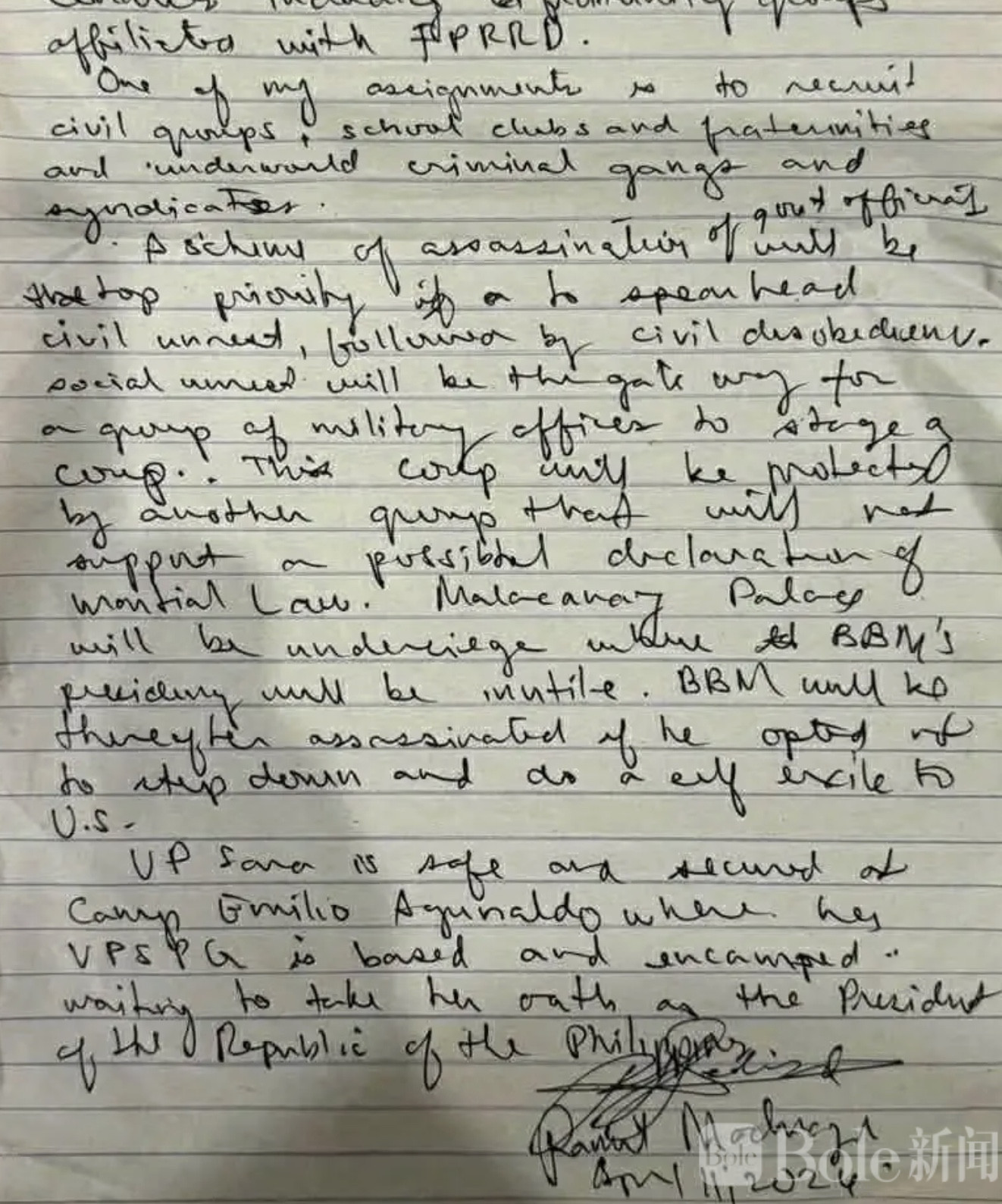 Bole新闻专讯:菲律宾媒体披露一封据称由“白手套”拉米尔·马德里亚加(Ramil Madriaga)书写的手写信件,内容涉及前总统杜特尔特及副总统莎拉·杜特尔特的政治安排设想,引发舆论震动。信中提到,杜特尔特据称曾计划在2025年推动政权更替,让现任总统马科斯下台,由莎拉接任。