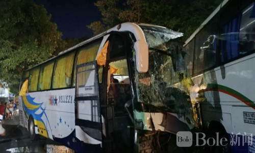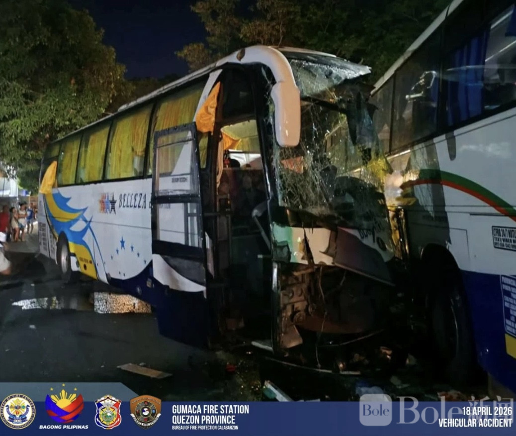 Bole新闻专讯:4月18日凌晨,奎松省古马卡镇发生一起三车连环交通事故,一辆轿车失控后引发两辆客运巴士相撞,现场一度混乱,6人受伤被紧急送医。