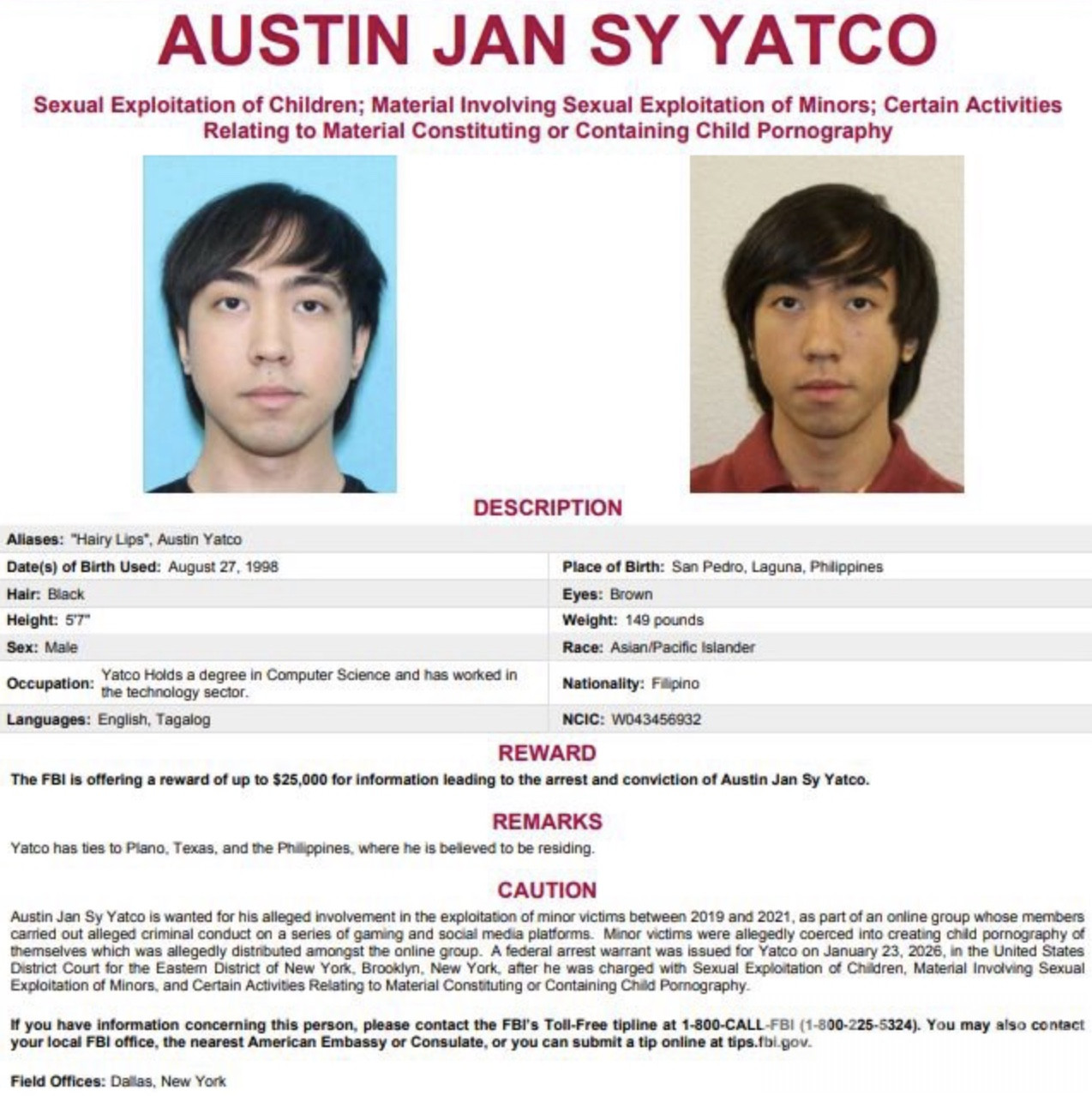 Bole新闻专讯:美国联邦调查局(FBI)近日发布悬赏通告,提供2.5万美元奖金征集线索,以协助逮捕并定罪菲律宾籍男子奥斯汀·亚特科(Austin Yatco),其被指涉嫌参与制作及传播儿童色情内容。