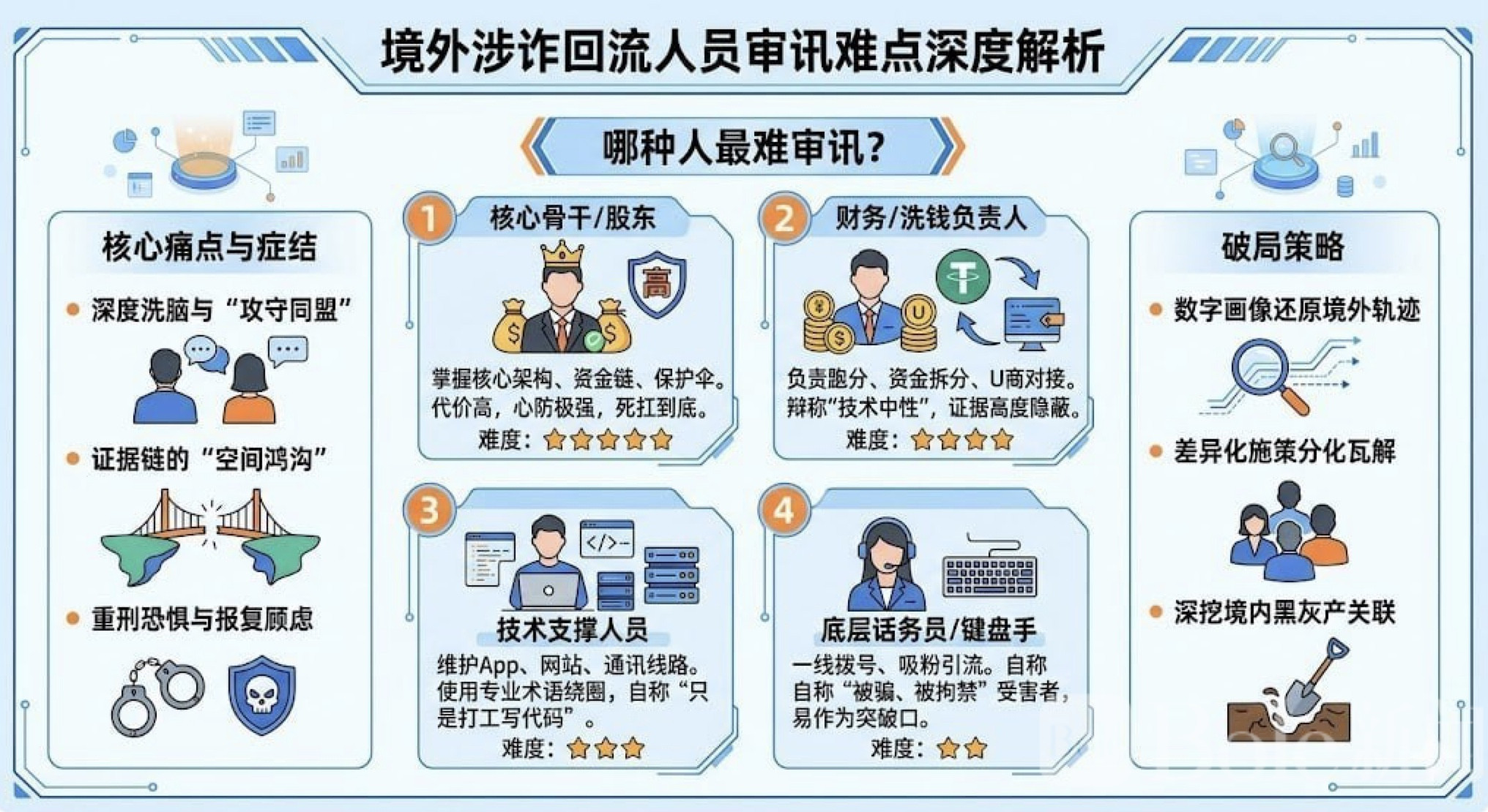 Bole新闻专讯:随着跨境执法合作不断加强,近年来大批曾在境外从事电信网络诈骗活动的嫌疑人被抓获或主动回国,这些人被统称为“境外回流人员”。他们中的不少人曾长期活跃在东南亚、中东等地区的诈骗窝点,一直站在诈骗链条的前线。对执法部门而言,这些回流人员往往掌握着诈骗集团内部结构、资金流向乃至幕后操盘者的重要信息,可以说是撬开整个犯罪网络的关键钥匙。不过,真正进入审讯阶段才发现——要让他们开口,并不容易,而且不同角色之间,难度差别相当明显。
