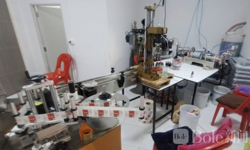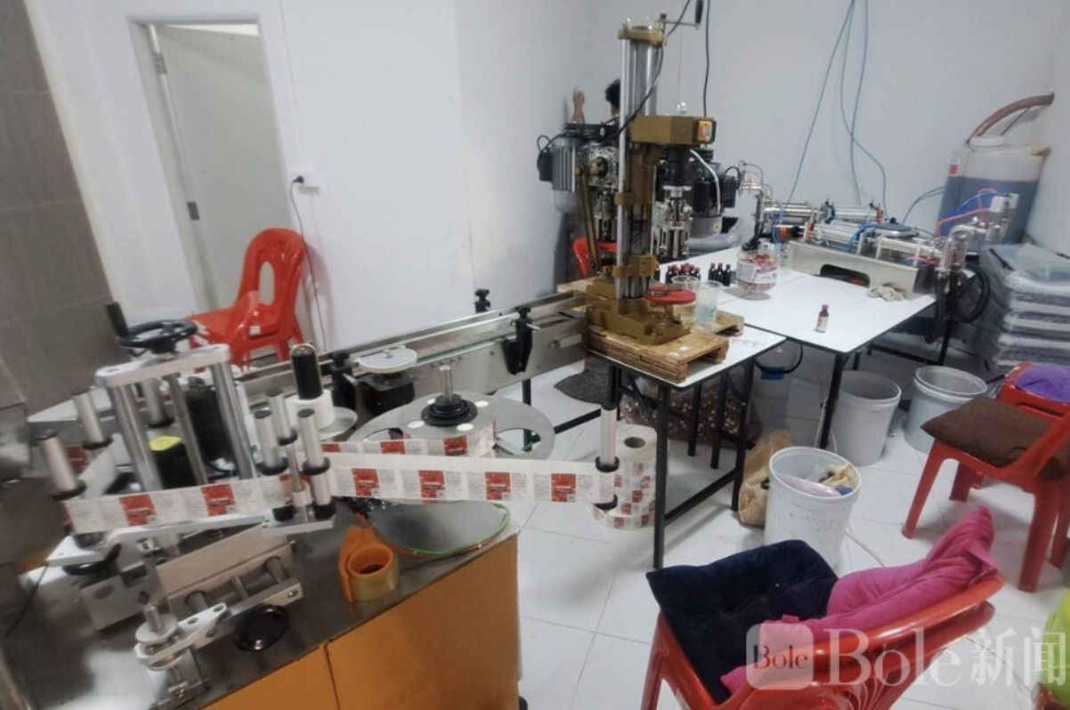 执法人员进入现场后发现,有4名男女嫌疑人正在将液体灌装进药瓶中,现场还配有完整的灌装设备、药液容器、瓶身标签及瓶盖等生产工具。经初步核查,该产品为仿冒某知名止咳糖浆品牌。