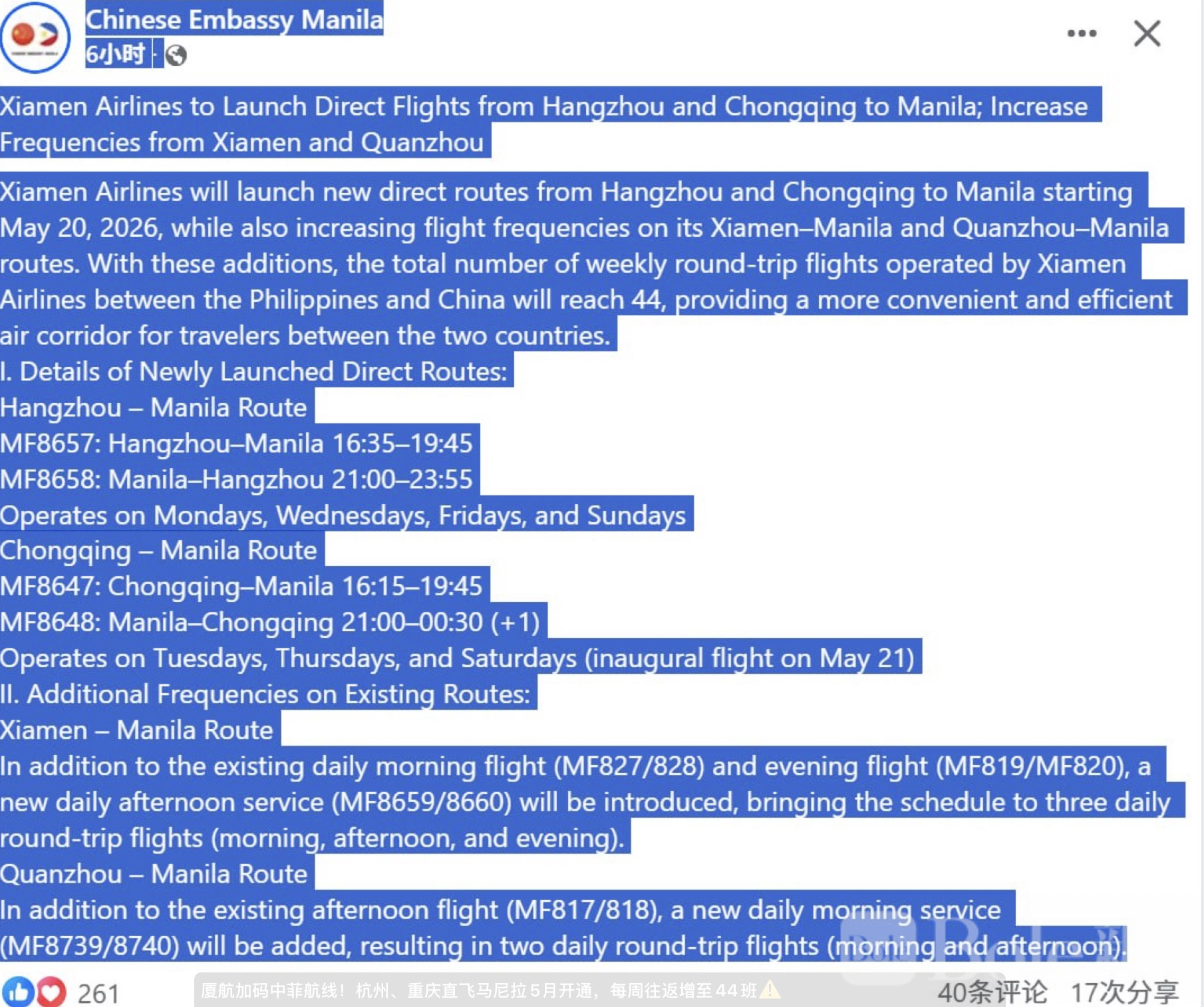 Bole新闻专讯:中国驻马尼拉大使馆于4月25日发布消息,厦门航空将于2026年5月起进一步加码中菲航线网络,新增杭州、重庆直飞马尼拉航线,并同步加密厦门及泉州往返航班。航线调整完成后,中菲之间每周往返航班总量将提升至44班,为两国旅客提供更多出行选择。