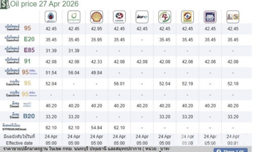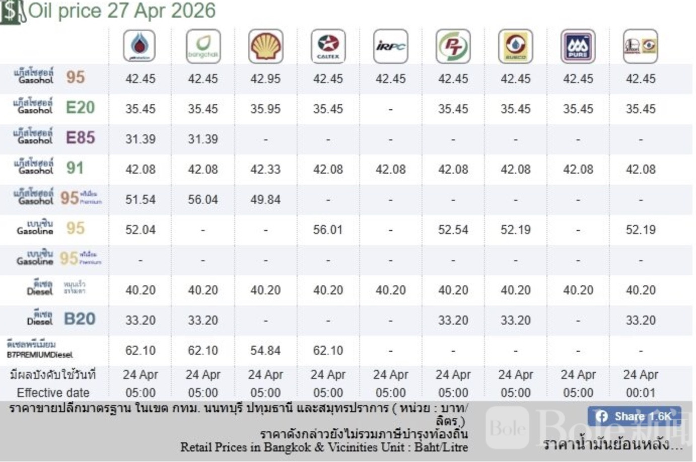 Bole新闻专讯:泰国能源政策与规划办公室发布最新油价数据,更新截至2026年4月27日,涉及全境五大主要加油站,包括国家石油公司(PTT)、邦乍石油(Bangchak)、PT油站、壳牌(Shell)及加德士(Caltex)。此次公布数据显示,不同品牌油站之间油价存在一定差异,主要集中在汽油与高级柴油产品区间,反映出当前能源市场价格分层明显。
