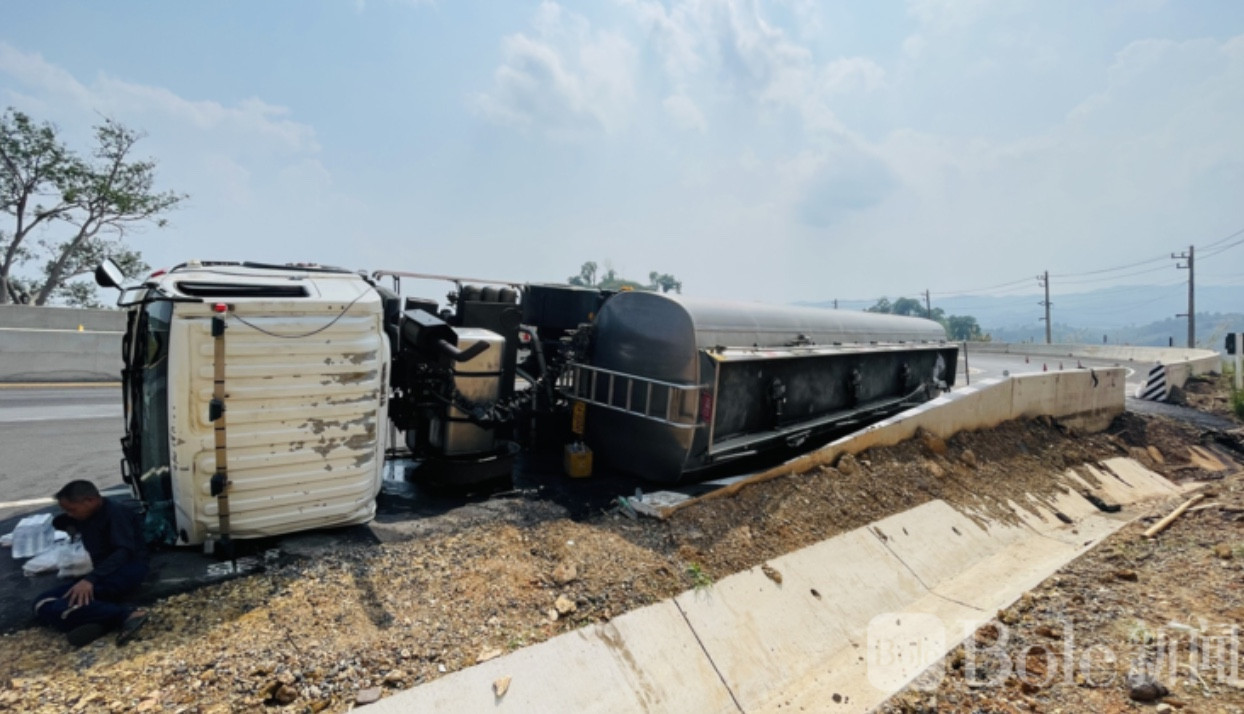 Bole新闻专讯:泰国楠府通昌县27日发生一起油罐车侧翻事故,一辆载有约4万升燃油的半挂油罐车在弯道路段失控翻覆,约5000升燃油泄漏并流到路面,一度引发紧张气氛。所幸当地多部门迅速赶到现场处置,目前情况已经基本稳定,道路交通也恢复正常。