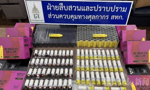 执法人员在过去一周对申报为“杂项商品”的进口货物进行重点检查,共涉及4项货物。经开箱核查,发现大量未申报违禁品,其中包括成品电子烟52,000件,以及烟油100加仑,总重量约2,000公斤,估值约5.56百万泰铢。该类商品属于泰国法律明确禁止进口的违禁物品。