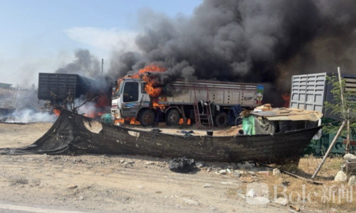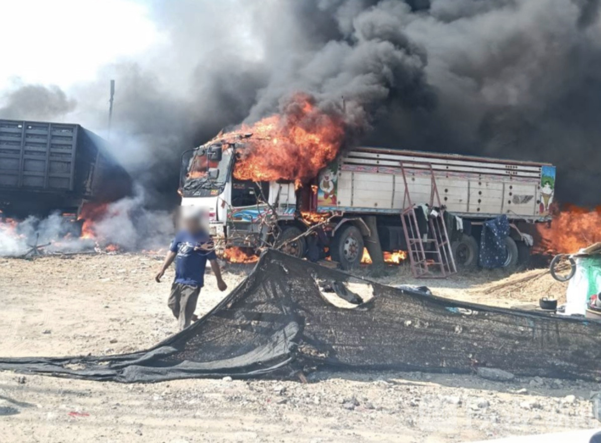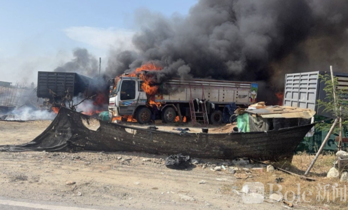 Bole新闻专讯:泰国曼谷邦坤田地区30日发生一起严重火灾事故,位于安纳迈南革乍伦巷25巷2分巷内,两辆10轮大型货车突然起火燃烧,火势猛烈并迅速蔓延,现场浓烟冲天,场面十分惊险。