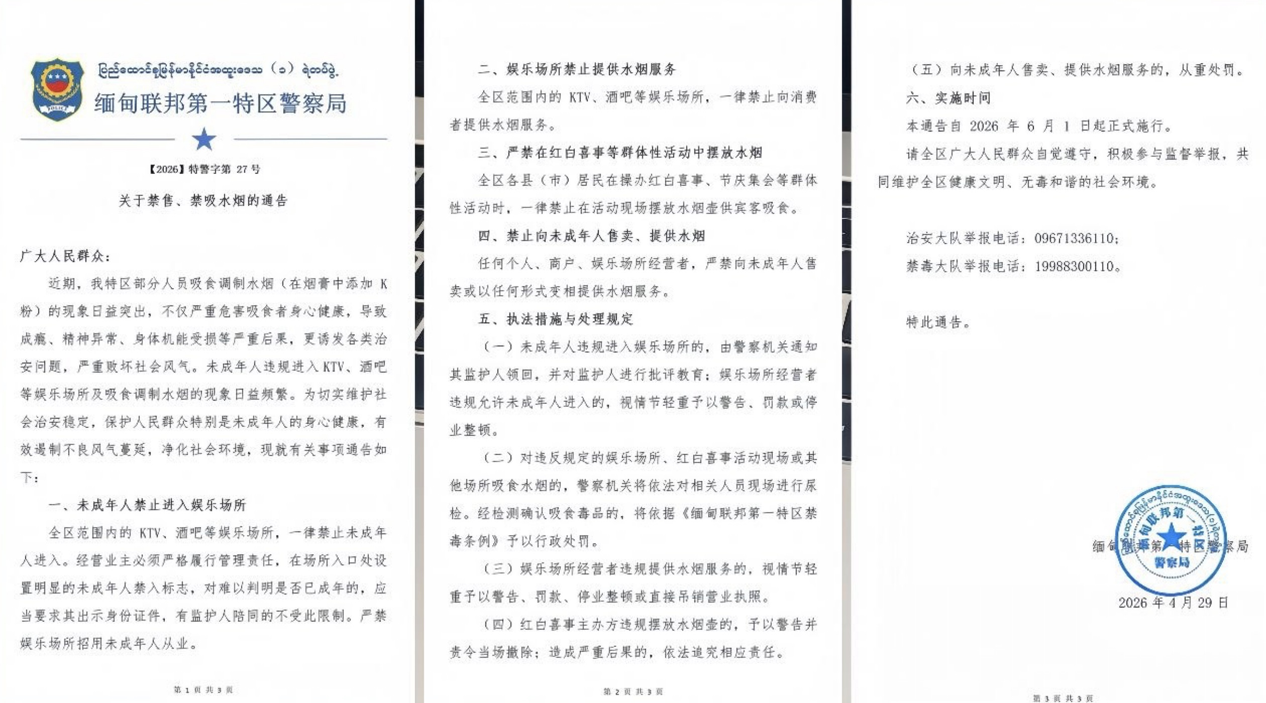 Bole新闻专讯:为进一步打击水烟中可能掺入K粉等毒品的违法乱象,维护社会治安稳定并保障公众尤其是未成年人的身心健康,缅甸联邦第一特区警察局正式发布【2026】特警字第27号通告,自2026年6月1日起在全区范围内实施全面水烟管控措施。
