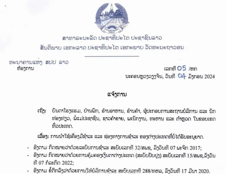 通知要求所有酒店、宾馆、餐馆、商店、服务场所和旅游业经营者,不得使用未经允许的支付工具或渠道,违者将被视为违法行为。违规者应立即停止使用非经老挝央行授权的支付方式,转而通过经授权的商业银行或法人接收付款。
