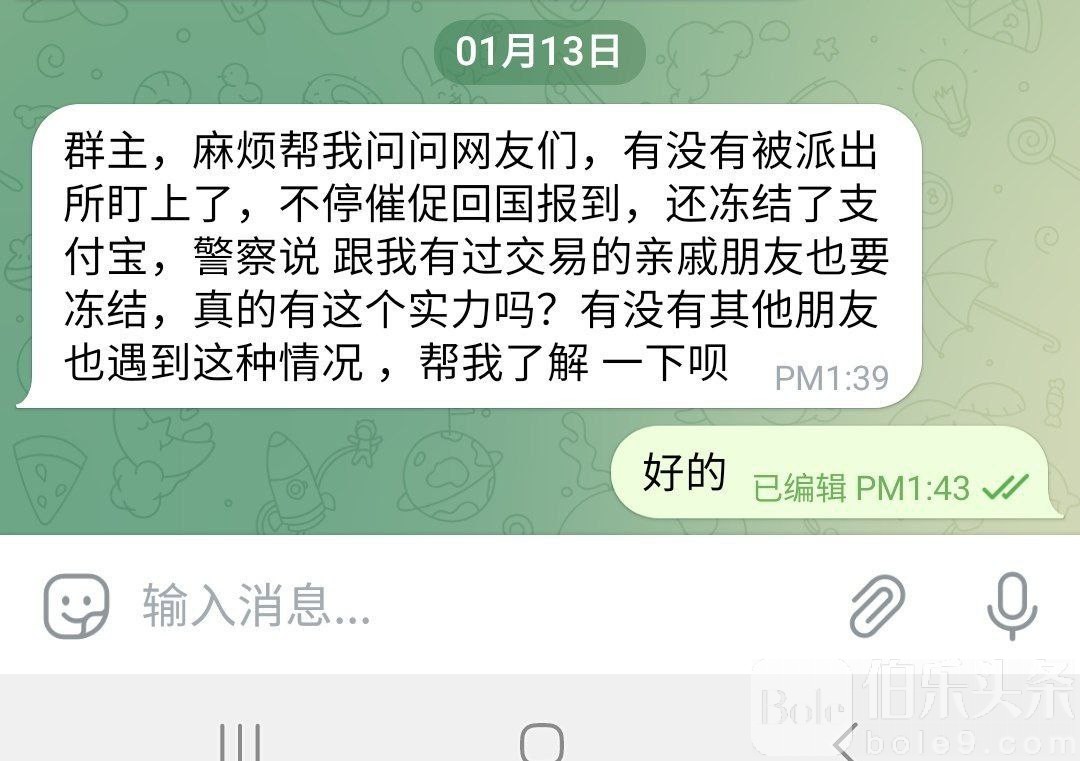 伯乐头条专讯:网友求助:群主,麻烦帮我问问网友们,有没有被派出所盯上了,不停催促回国报到,还冻结了支付宝的?