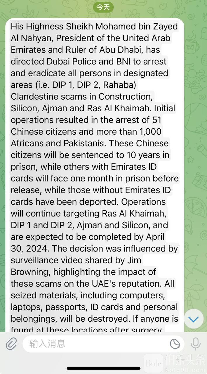 伯乐头条专讯:网友投稿,阿联酋总统、阿布扎比统治者谢赫穆罕默德·本·扎耶德·阿勒纳哈扬下令迪拜警方和BNI逮捕并铲除指定地区(即DIP 1、DIP 2、Rahaba)的所有人在建筑、硅谷、阿吉曼和拉斯阿尔哈马的秘密诈骗活动。