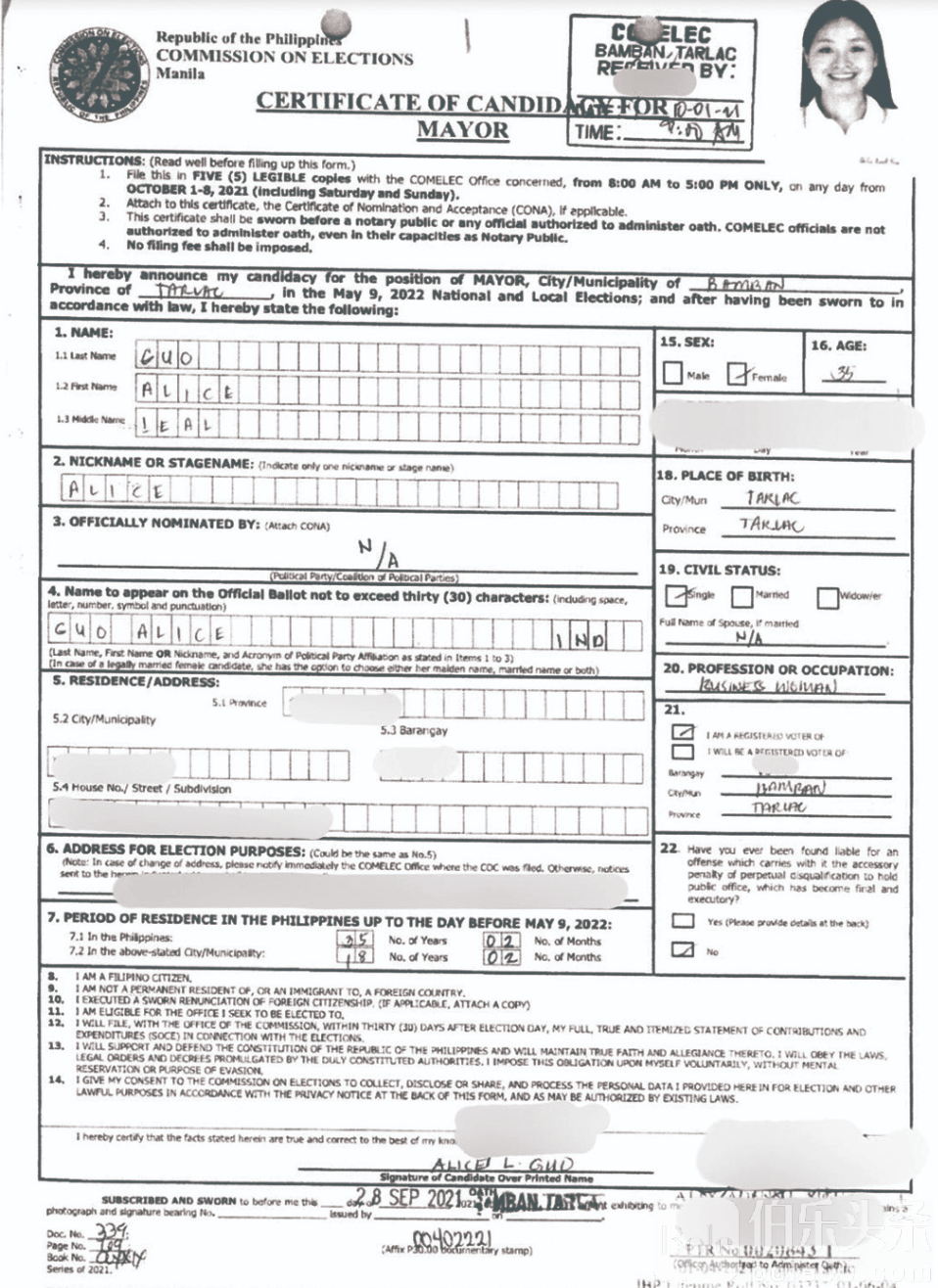 根据选举署向参议院妇女、儿童、家庭关系和性别平等委员会发送的一份她的候选人资格证书副本,郭华萍的全名标注为“爱丽丝·莉儿·郭”(Alice Leal Guo),35岁,居住地址在“丹辘省班班社”(Bamban, Tarlac),是该地区的登记选民。