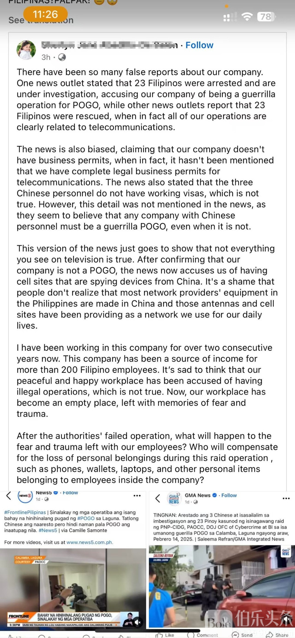 伯乐头条专讯:近日,菲律宾移民局(BI)联合总统反有组织犯罪委员会(PAOCC)突袭拉古纳省卡兰巴市(Calamba)一栋办公大楼,并逮捕三名中国公民,指控其涉嫌从事非法博彩和未获授权的电信业务。然而,该公司的多名员工随后在社交媒体上发文,否认公司涉及POGO(菲律宾离岸博彩运营商),质疑执法行动的正当性,并表示员工权益受到严重影响。